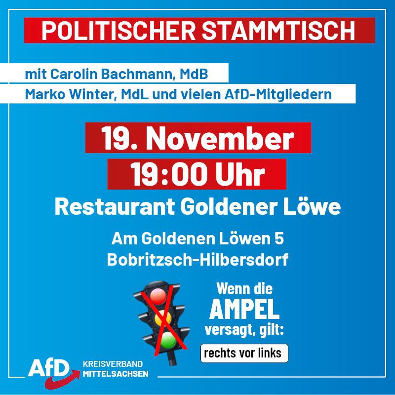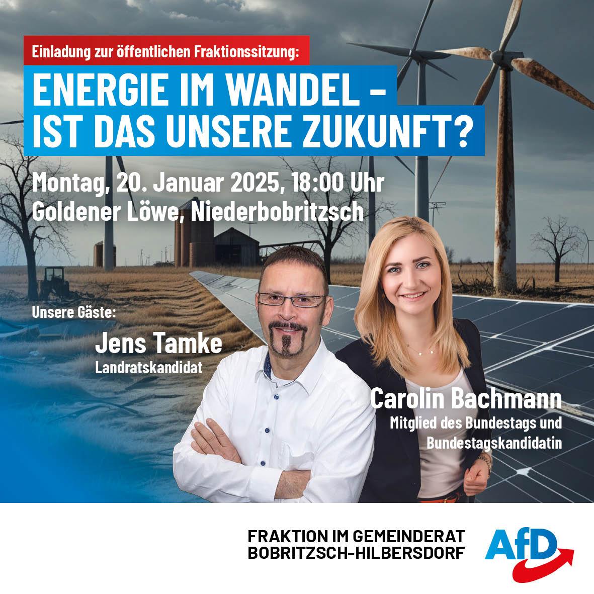 Hiermit laden wir alle interessierten Bürger am Montag, den 20.01.2025 um 18 Uhr zur ersten öffentlichen Fraktionssitzung der AfD-Fraktion im Gemeinderat Bobritzsch-Hilbersdorf in den Goldenen Löwen in Niederbobritzsch herzlich ein.