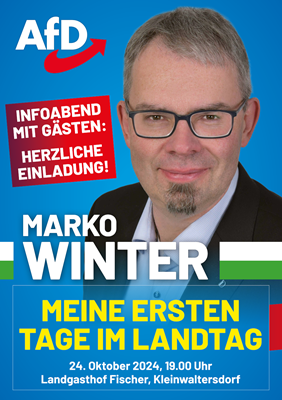 Für Donnerstag, den 24.10., lädt Marko Winter, der im Wahlkreis 17 direkt gewählte Abgeordnete, zu einer Informationsveranstaltung mit einem Bericht über seine ersten Arbeitstage im sächsischen Landtag und musikalischer Umrahmung ein. Diese findet ab 19 Uhr im Landgasthof Fischer (Walterstal 57) im Freiberger Ortsteil Kleinwaltersdorf statt.